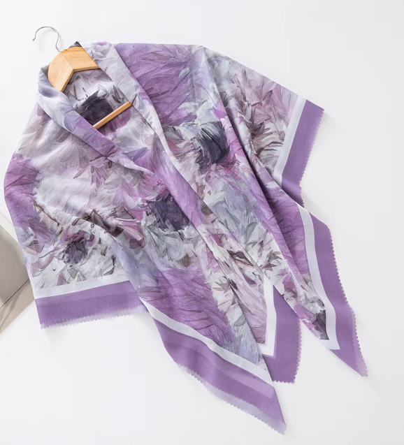 Inspired by Jumana (Arabic: جمانة, meaning “silver pearl”), the Jumana scarf exudes refinement and sophistication. Its violet base features painterly violet flowers, creating a delicate, artistic look.